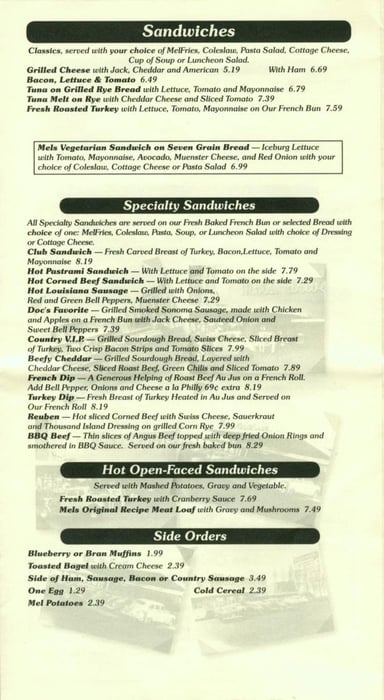 Three-egg omelette stuffed with ham, grilled peppers, onions, and cheese mix. Served with hash browns or Mels potatoes and toast.